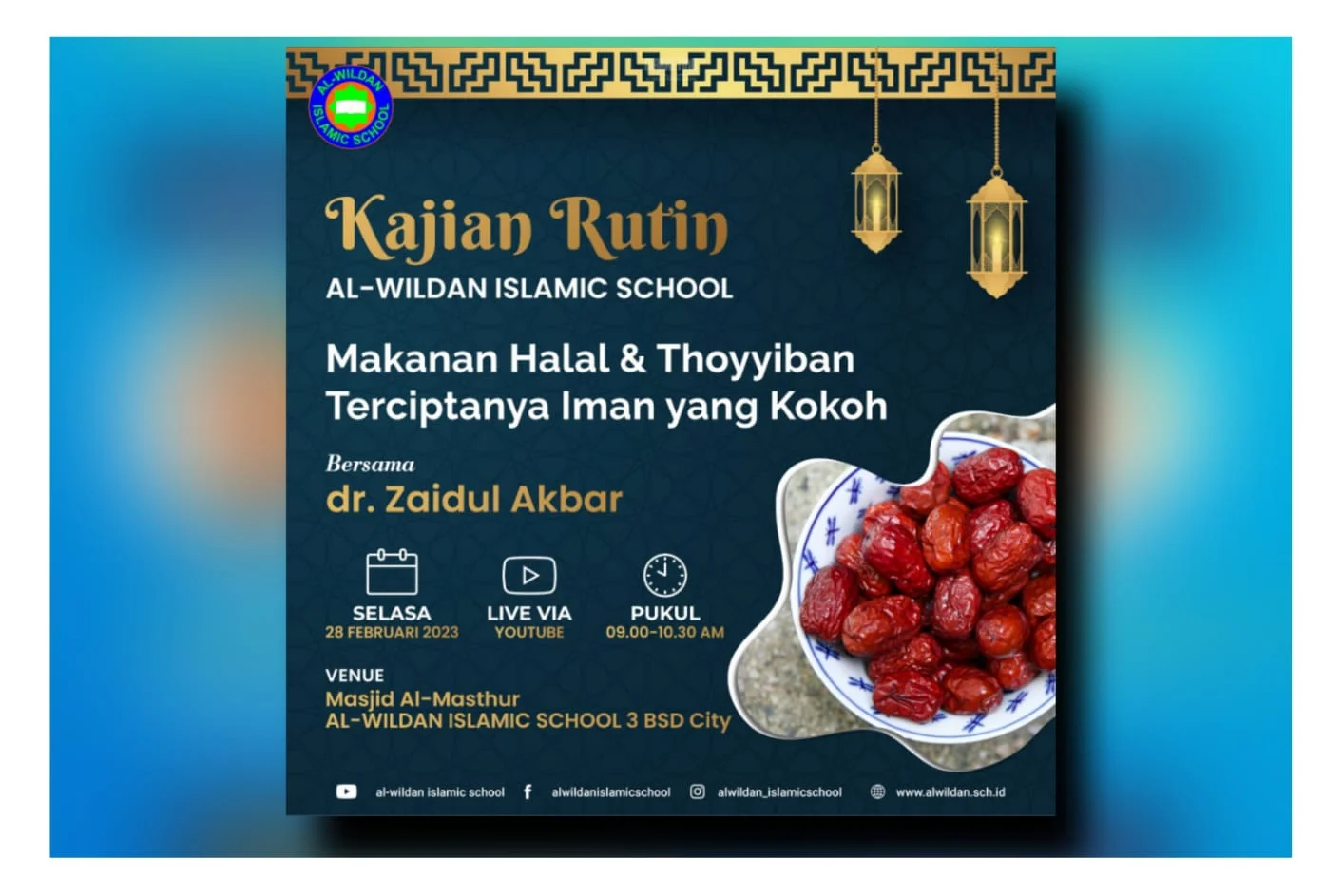 Saksikan Kajian Online bersama dr. Zaidul Akbar, yang bertujuan untuk mempererat hubungan silaturahmi dan memperluas wawasan keagamaan antara Lembaga Pendidikan AL-WILDAN ISLAMIC SCHOOL, yang akan dilaksanakan melalui platform YouTube secara langsung (live).