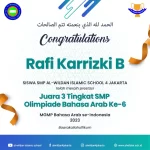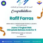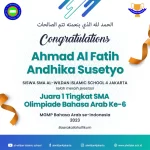 Kabar baik telah datang dari Olimpiade Bahasa Arab (OBA) ke-6 tingkat Provinsi DKI Jakarta yang diselenggarakan oleh Musyawarah Guru Mata Pelajaran (MGMP) Bahasa Arab se-Indonesia. Ananda sholih yang telah mengikuti OBA untuk jenjang SMA dan SMP AL-WILDAN 4 JAKARTA telah menunjukkan prestasi yang membanggakan. Inilah para juara kita: