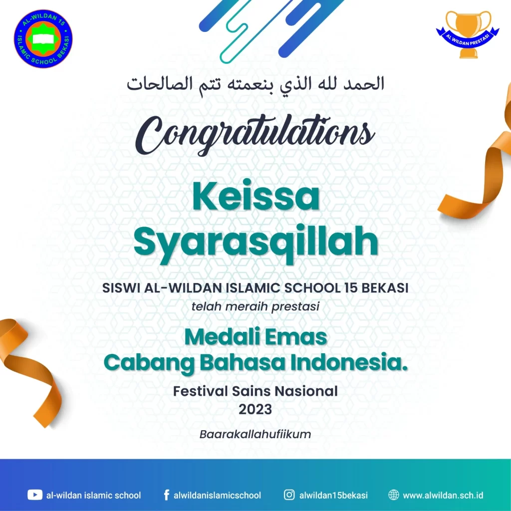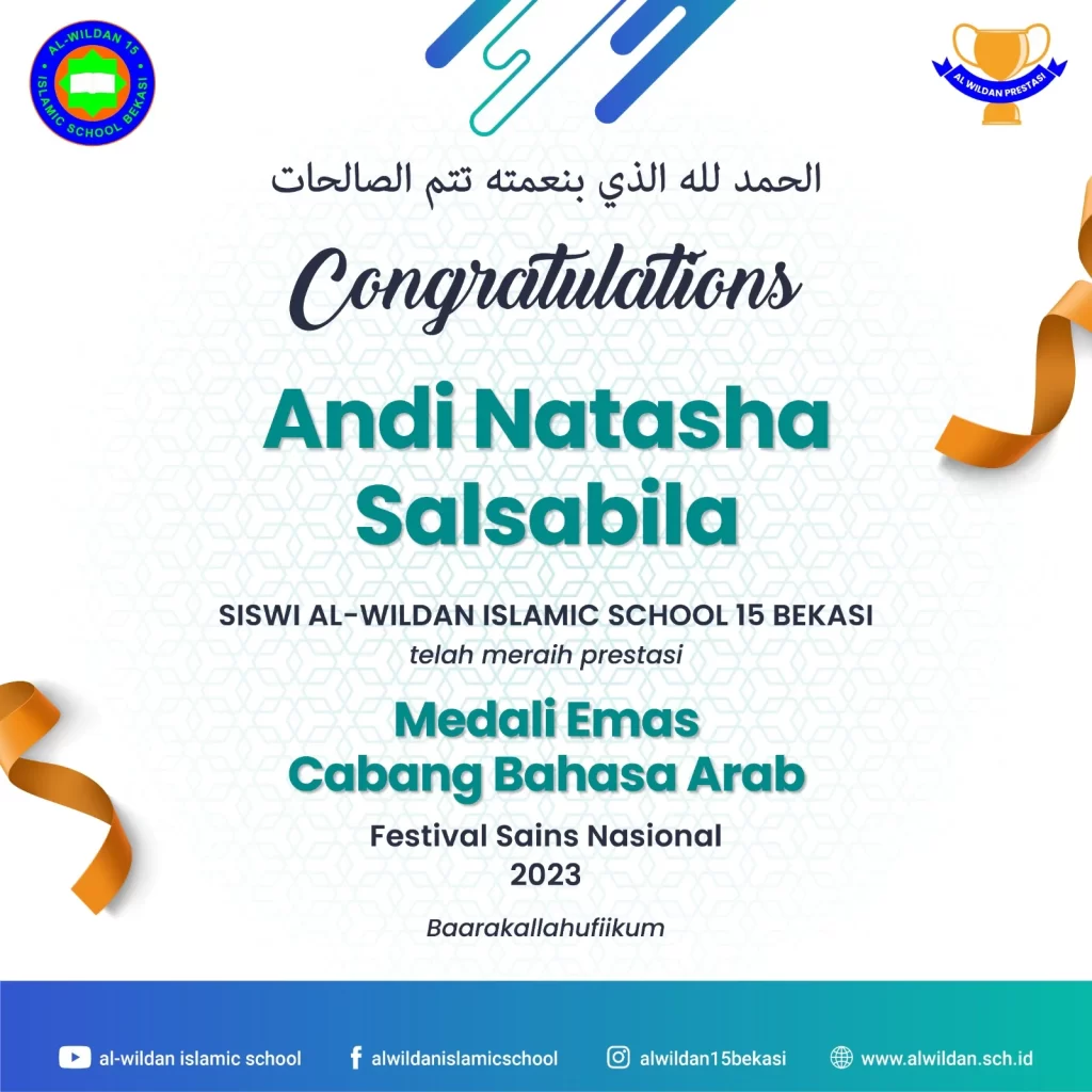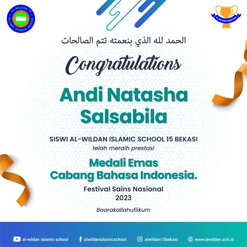 AL-WILDAN ISLAMIC SCHOOL 15 Bekasi meraih pencapaian luar biasa dalam Festival Sains Nasional 2023. Dalam kategori Bahasa Arab dan Bahasa Indonesia, AL-WILDAN ISLAMIC SCHOOL 15 Bekasi berhasil mencatat sejarah dengan prestasi gemilang yang membanggakan.