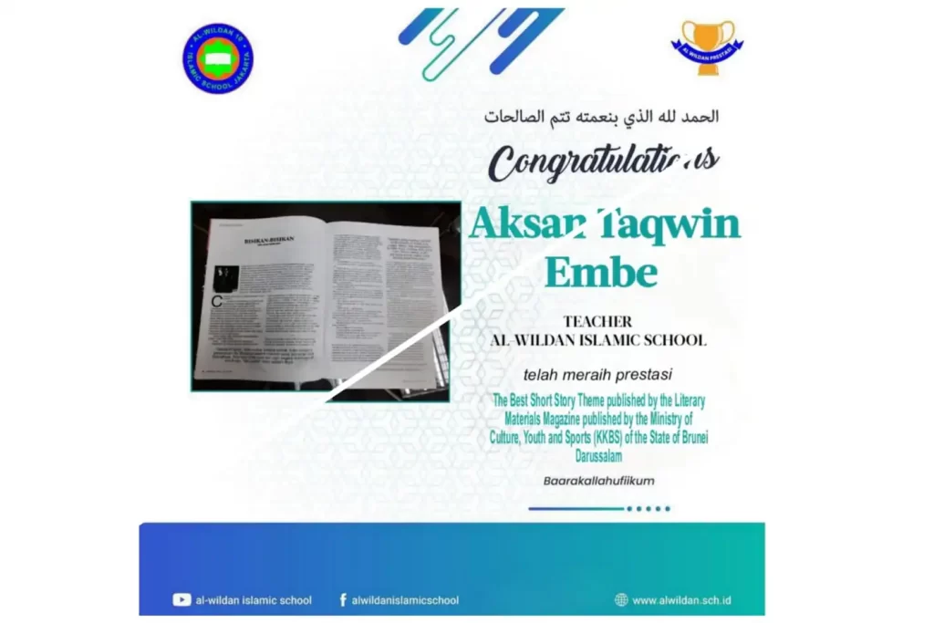 Masyallah Wa Tabaarakallah. SDM AL-WILDAN kembali membuktikan prestasinya, Aksan Taqwin Embe, guru AL-WILDAN INTERNATIONAL ISLAMIC SCHOOL telah menerima penghargaan sebagai