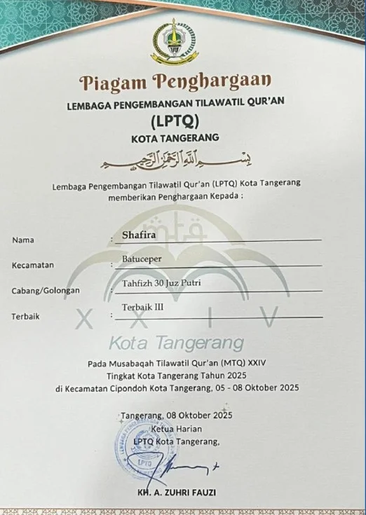 Juara 3 | Tahfizh 20 Juz MTQ XXIV